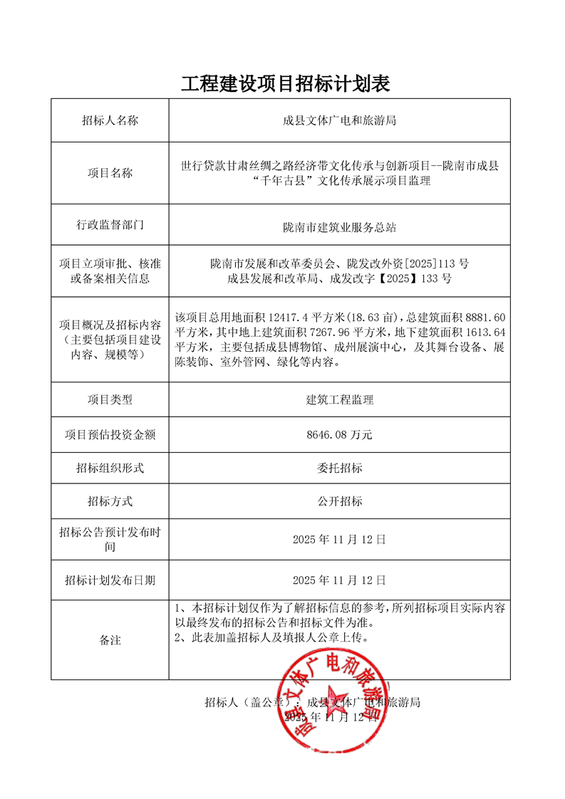 附件:工程建設項目招標計劃表世行貸款甘肅絲綢之路經濟帶文化傳承與創(chuàng)新項目--隴南市成縣“千年古縣”文化傳承展示項目監(jiān)理.pdf
